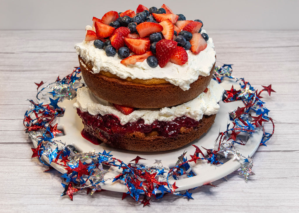 - On top of the second cake layer, add more whipped cream and sliced strawberries and blueberries.