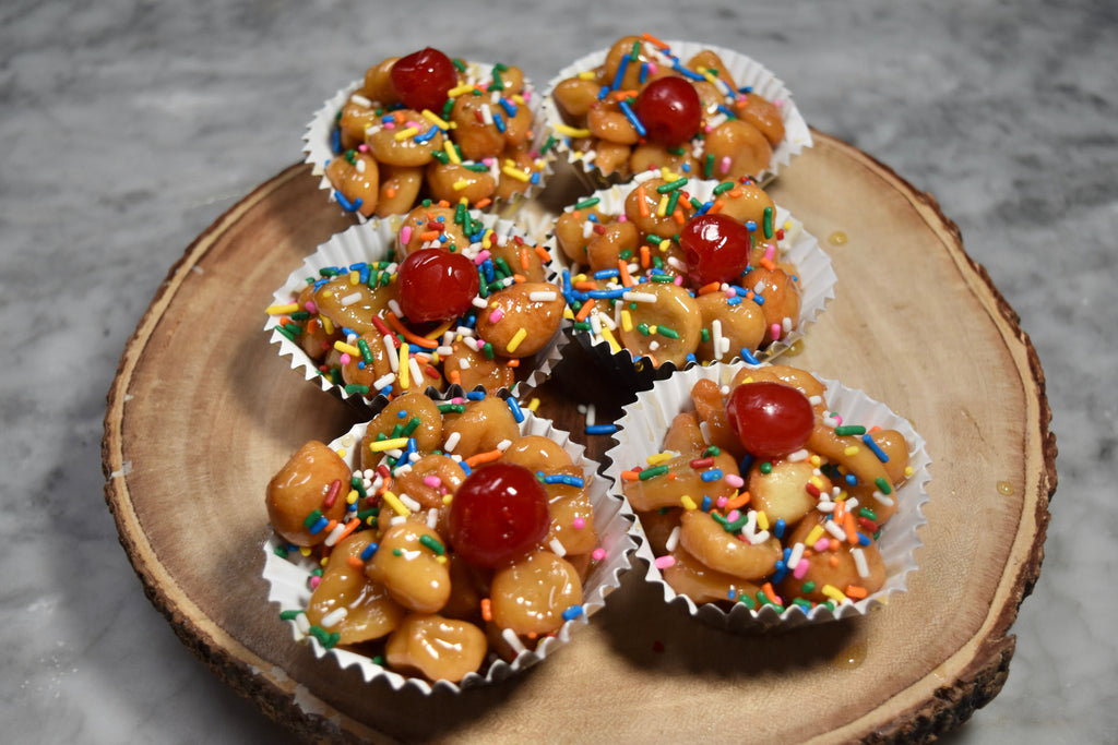 Indulge in an Italian classic with this struffoli recipe! These golden, bite-sized dough balls are fried to perfection, then coated in a warm honey syrup, sprinkled with colorful nonpareils, and served in the shape of a pyramid.